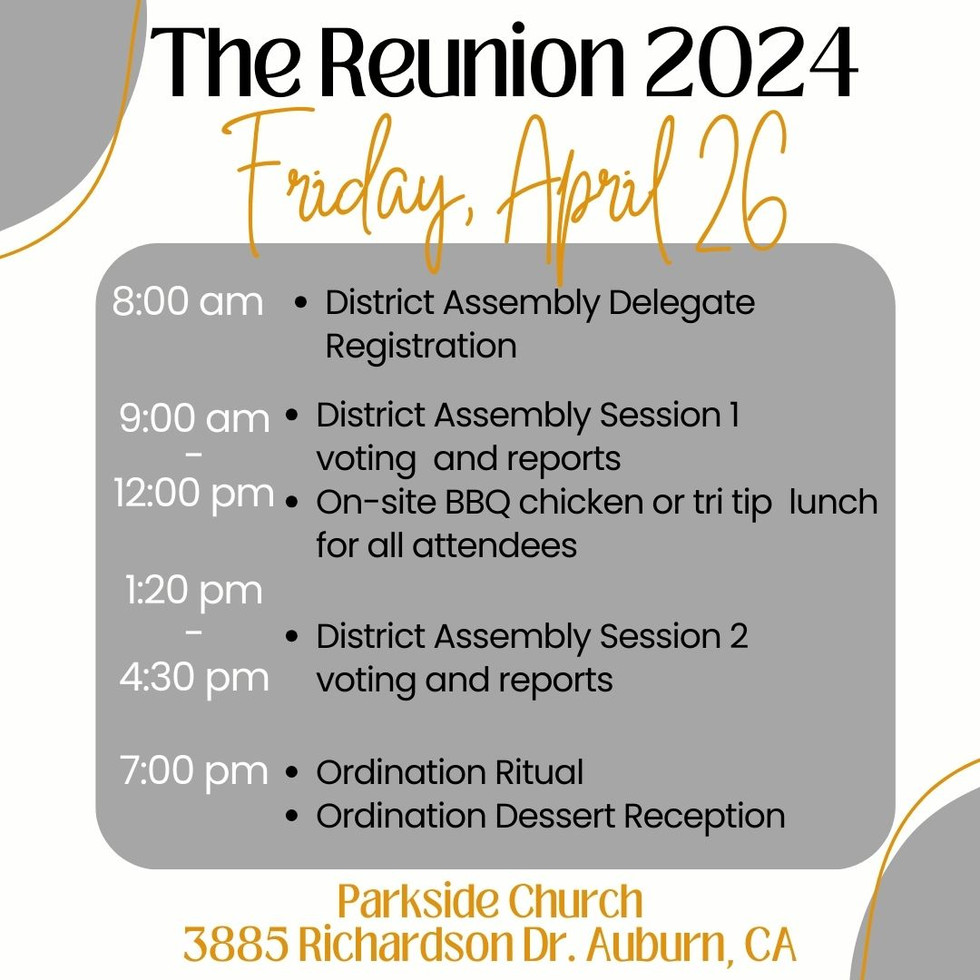 | April 25-27 | The Reunion (District Assembly & Conventions) | Auburn, Parkside - www.sacnaz.org/districtcalendar |